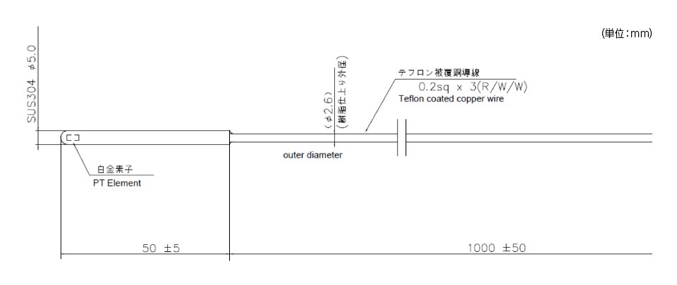 Resistance value R0=100Ω PT100 (ex.) B constant 3851ppm/K (element) Operating temperature range -80℃~50℃ Structures